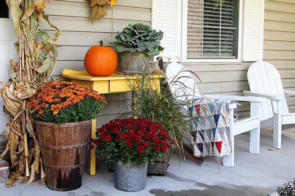 ✔ Place wooden crates filled with fall flowers like mums or sunflowers for a pop of color.