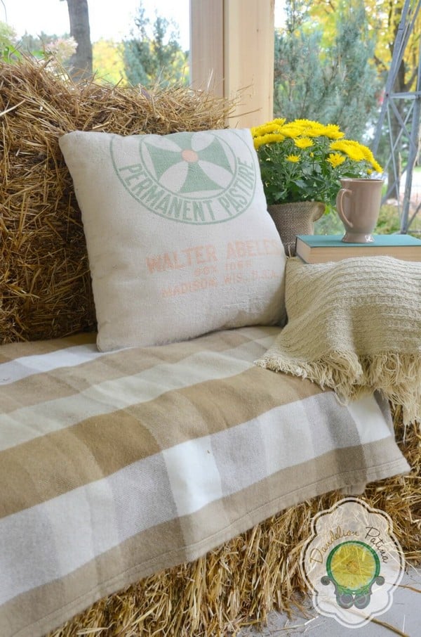 16. Cozy Haystack-Stuffed Porch Sofa – Add a rustic seating area with hay bales.