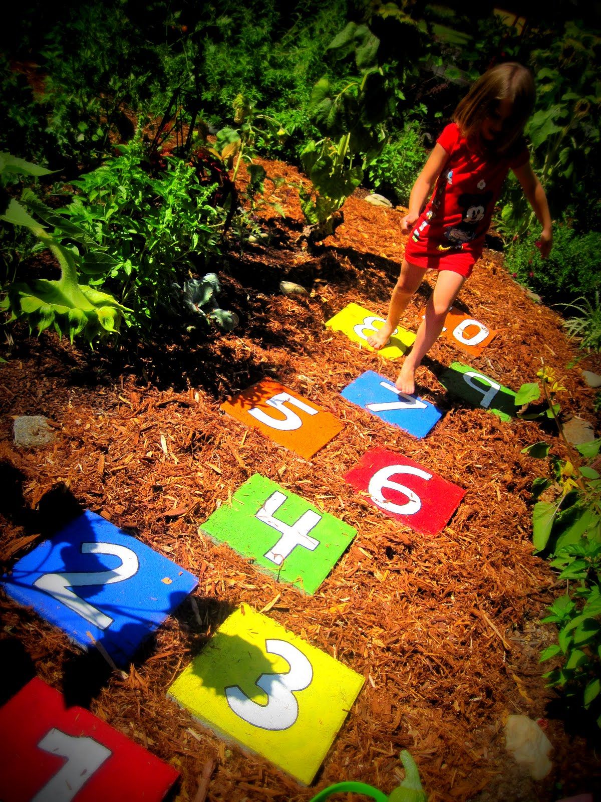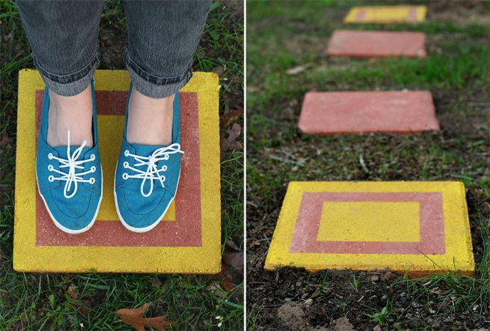 Turn your walkway into a game with numbered or patterned hopscotch stepping stones. Paint the numbers and decorate with outdoor-safe paint.