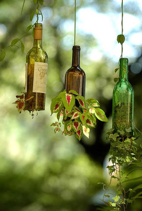 Cut the bottoms off old wine bottles and suspend them upside down to create modern hanging planters.