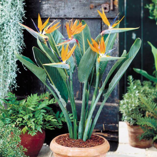 A tropical favorite with bright orange and blue bird-like flowers, this plant adds an exotic flair to warm-climate gardens and indoor containers.