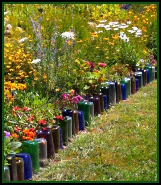Line up recycled glass bottles in vibrant colors to create a whimsical and eye-catching garden border.
