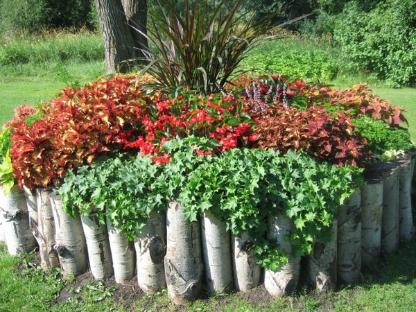 Use cut birch logs as a natural flower bed border.