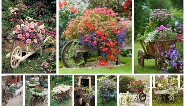 14. Wheelbarrow Planter Ideas – Give an old, rusted wheelbarrow new life as a mobile flower bed.