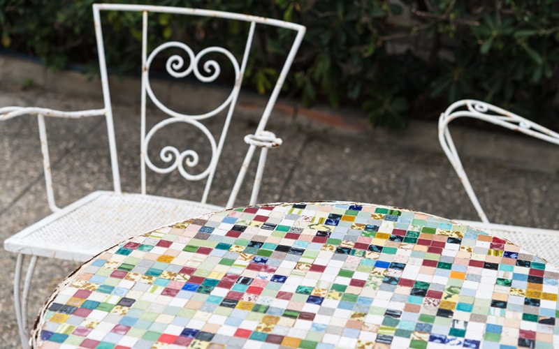 Revamp an old garden chair with colorful mosaic tilework, giving it new life as a striking conversation piece.