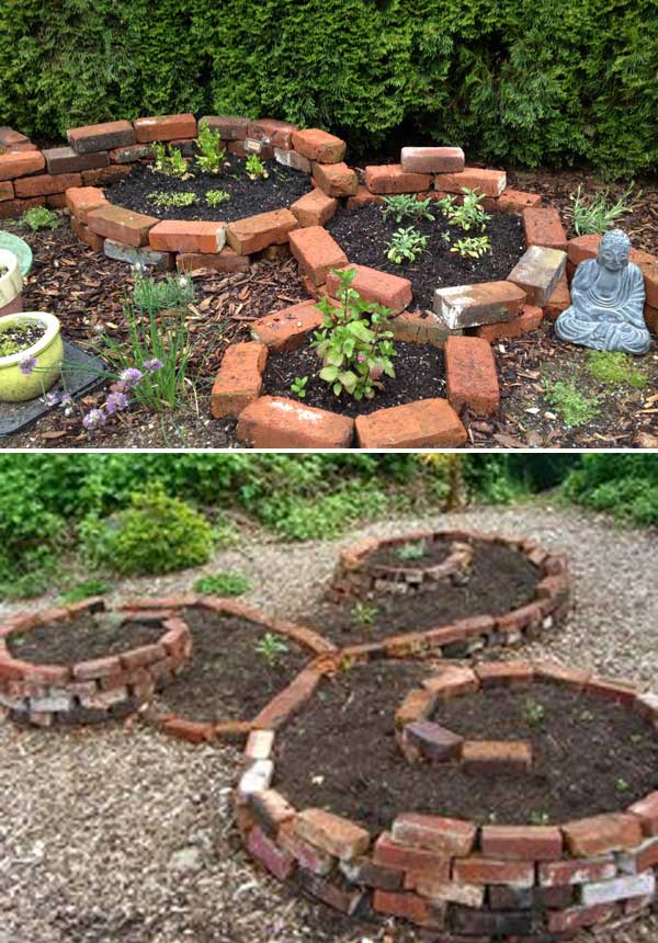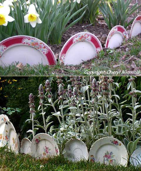 ✔️ Bury decorative plates halfway in the soil along the edge of your garden bed.