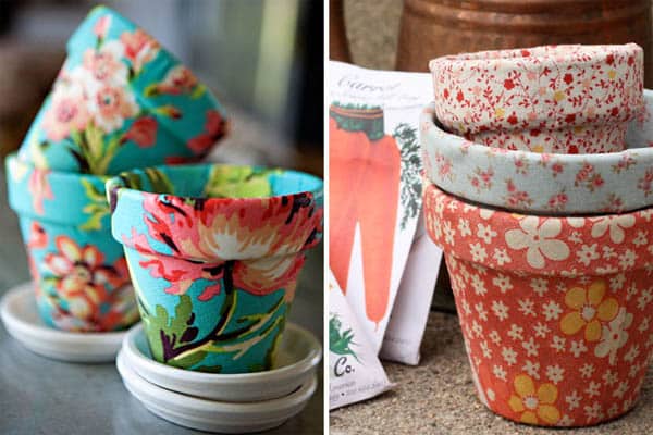 Give plain pots a makeover by wrapping them in colorful fabric or old clothes. Use waterproof glue or mod podge to secure the fabric.