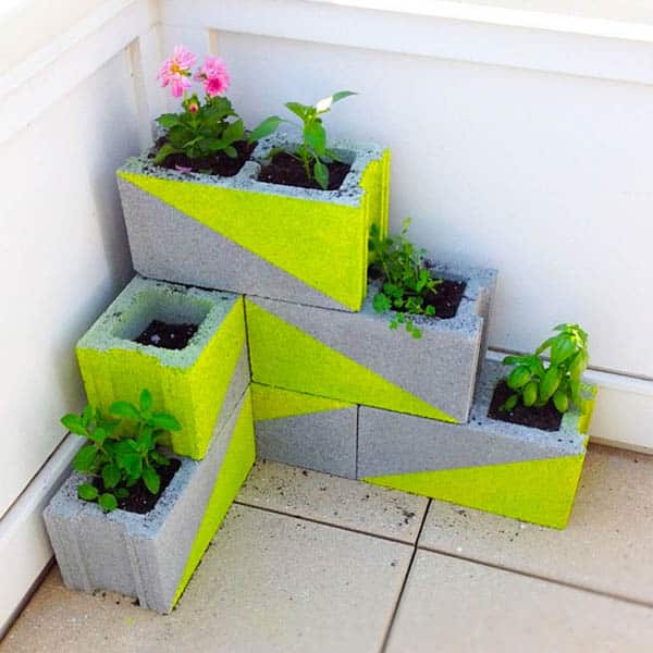 Paint concrete blocks in bright neon or pastel colors, stack them creatively, and plant herbs or succulents inside. They add a modern, urban vibe to any garden wall or patio.