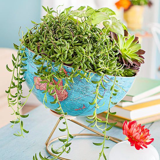 Have a broken or outdated globe? Cut it in half and use each side as a planter! The curved design adds visual interest and makes for a cool educational garden feature.