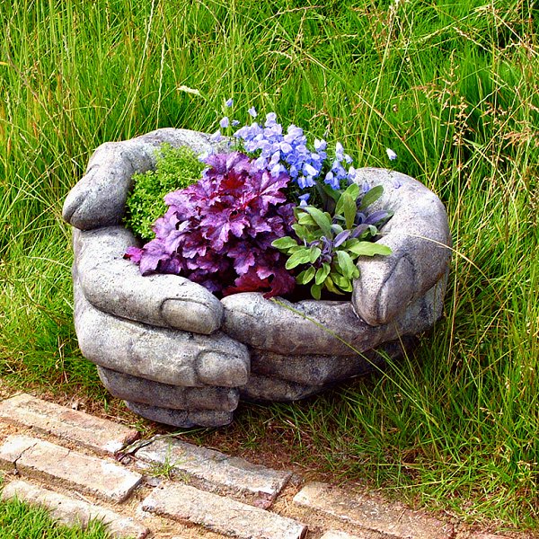 Use latex gloves as molds to create unique concrete hand-shaped planters. These eye-catching containers cradle succulents or moss for a sculptural effect.