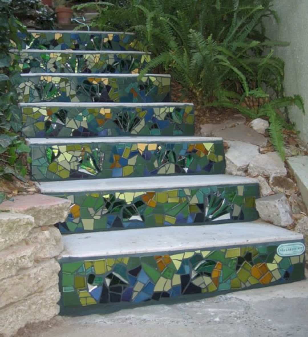 Add personality by covering the risers of plain stairs with colorful mosaic tiles made from broken ceramic, glass, or recycled plates. Every step becomes a piece of art.
