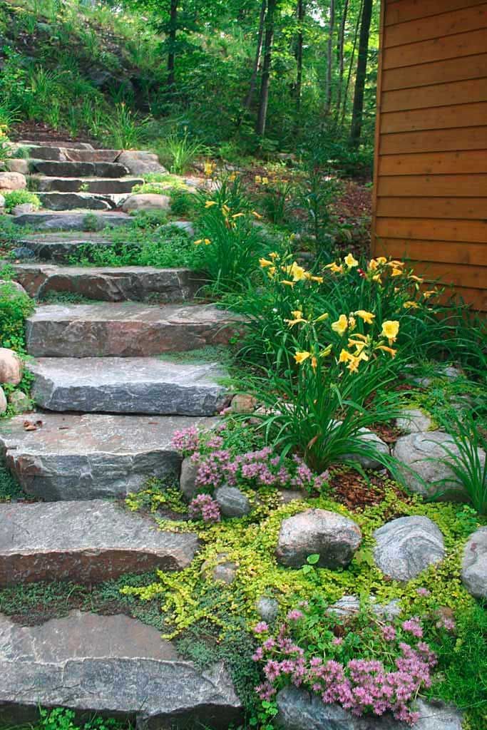 Use large boulders or stacked rocks to frame the sides of your steps, filling in the center with compact gravel or stone dust. It looks raw and untamed—in the best way.