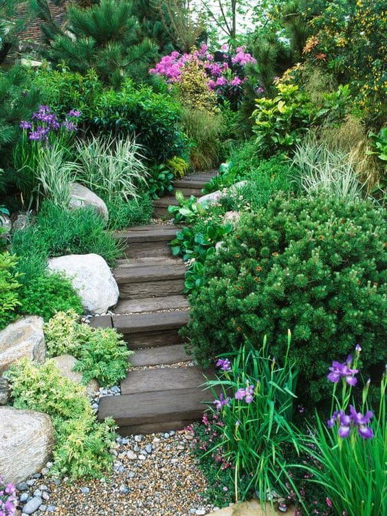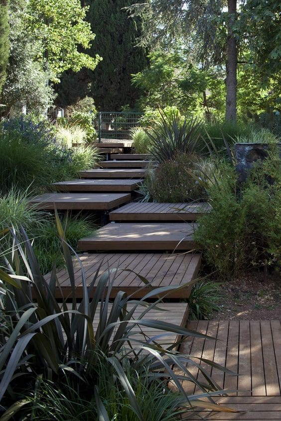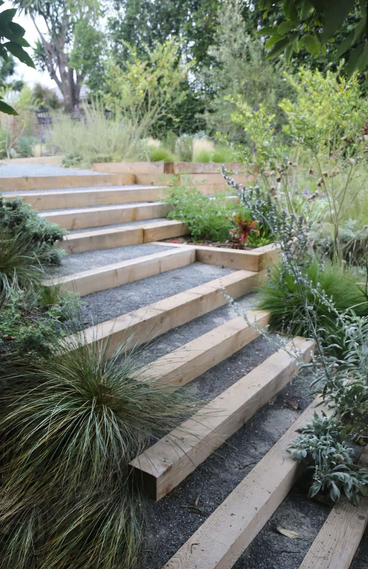Line a hillside with thick wooden planks as risers and fill with gravel for drainage. The result is a practical, slip-resistant staircase that feels both wild and refined.