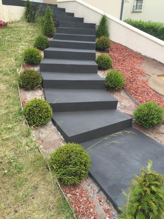 Modern and bold, black concrete stairs create strong lines and contrast. Combine with minimalist landscaping and large planters for maximum effect.