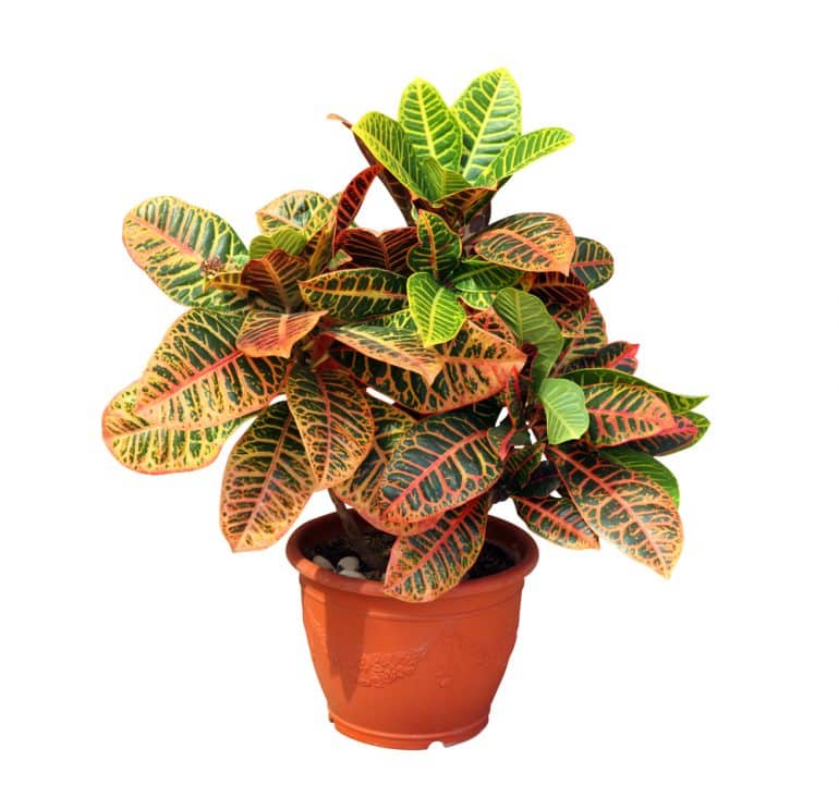 With its brilliant rainbow-colored foliage, Croton adds a vibrant splash to any room. Needs lots of sunlight to maintain bold colors.