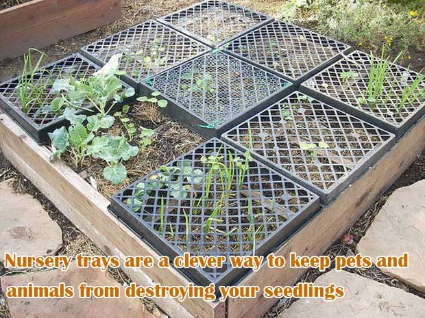 Flip over plastic nursery trays and place them over young seedlings to act as protective covers against pets and wildlife.