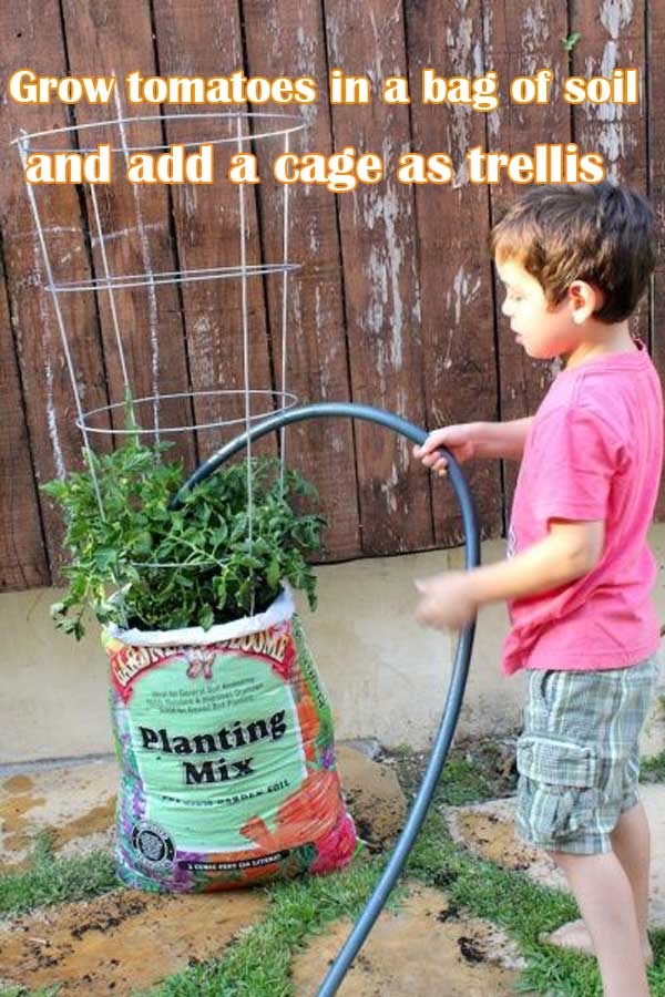 Lay a bag of soil flat, cut an opening at the top, and plant your tomatoes directly in it. Insert a tomato cage or trellis and water as needed.