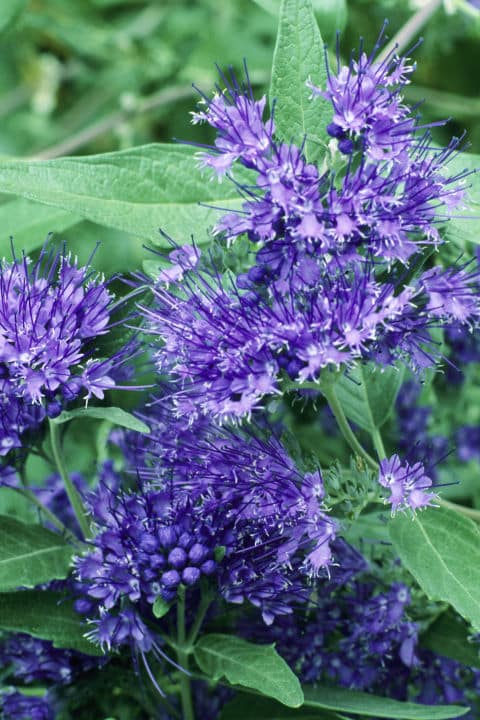 Caryopteris is a compact, bushy plant that produces clusters of bright blue flowers in fall.