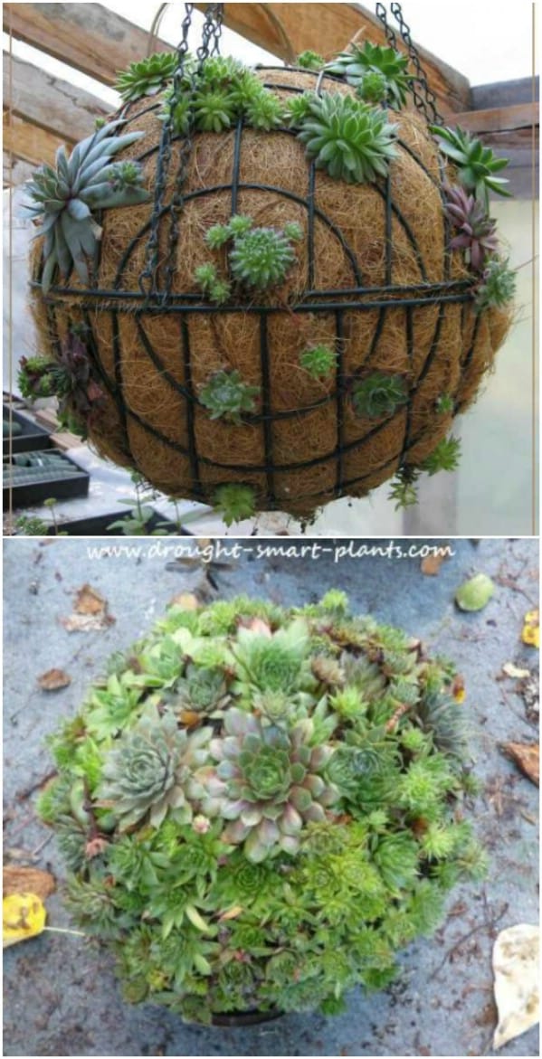 Create succulent balls or spheres using wire frames covered with moss and soil. These look stunning as hanging planters or garden centerpieces.