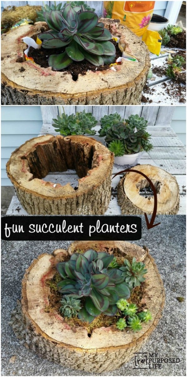 Turn a hollowed-out tree stump into a natural succulent planter for an earthy touch.