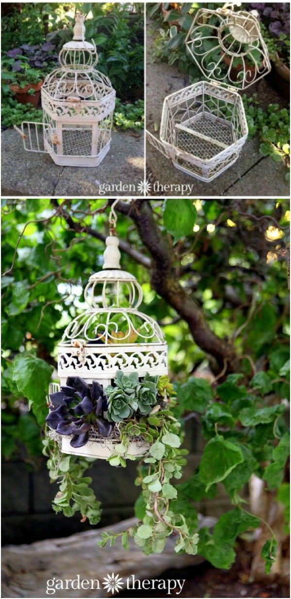 Repurpose an old birdcage into an elegant hanging succulent planter. Simply line it with moss or coconut fiber, fill it with soil, and add your favorite succulents.