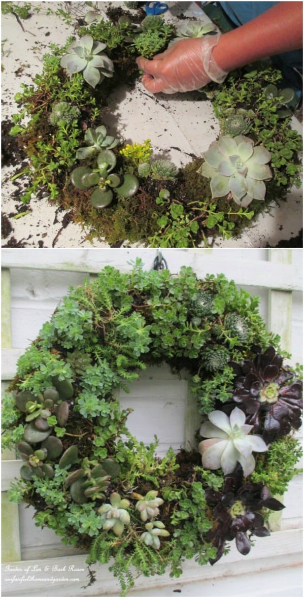A succulent wreath is a beautiful way to decorate doors or outdoor walls. Using a wire wreath frame, attach small succulents for a living decoration that lasts year-round.