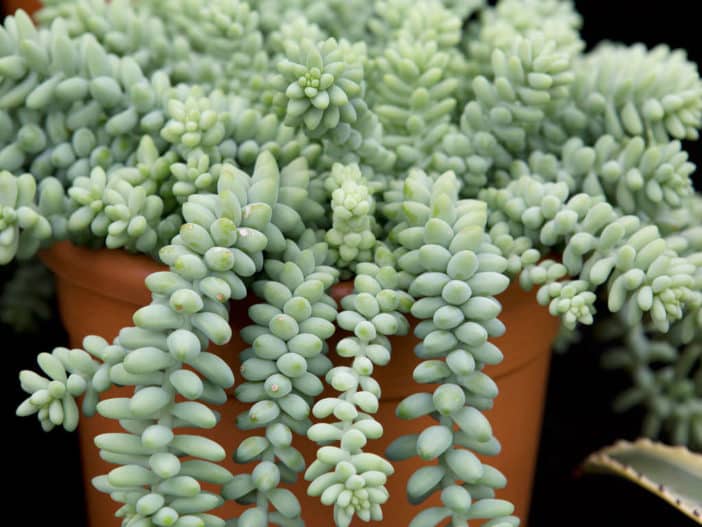 Often confused with Donkey’s Tail, Burro’s Tail is a more compact variety with densely packed, chubby, blue-green leaves. This succulent forms stunning, beaded stems that spill over the edges of pots and baskets.