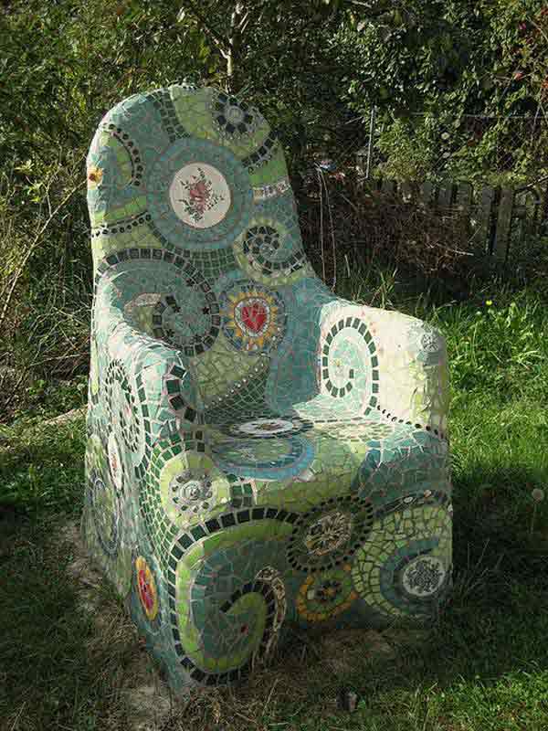 Rescue an old wooden or metal chair and turn it into a statement piece with mosaic on the seat or backrest. Use vibrant colors to make it pop among the greenery.