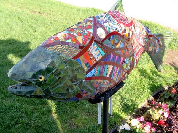 Craft a fish-shaped mosaic design from tiles, glass shards, and shells. Attach it to a fence, garden wall, or even use it as part of a water feature to give your garden an aquatic theme.