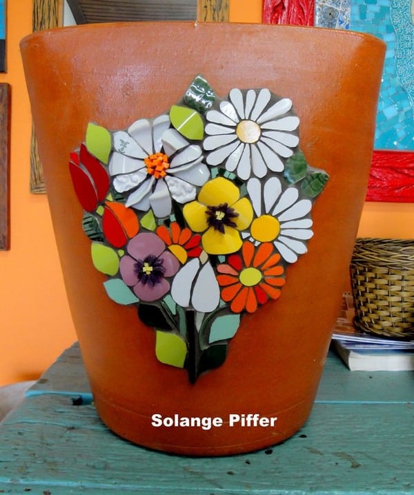 Design idea: Match the flowers in the mosaic with what you plant inside for a cohesive look.