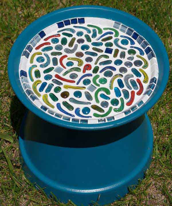 Upcycle an old bowl, plate, or shallow dish by embedding glass gems and tiles to make a dazzling mosaic bird bath. Mount it on a pedestal, a tree stump, or even hang it from a stand.