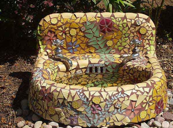 Upcycle an old sink into a water fountain with added mosaic design. Place mosaic tiles around the bowl, backsplash, and even the base for a truly artistic water feature.
