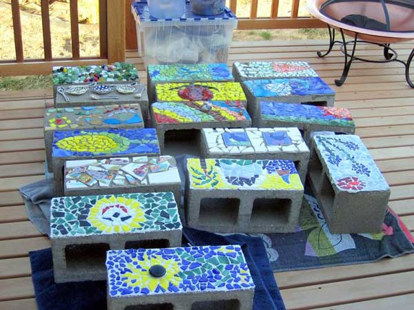 Stack concrete blocks as modular planters or retaining walls and decorate the exposed surfaces with mosaic art. Each block can feature a different pattern or color theme for a whimsical garden wall.