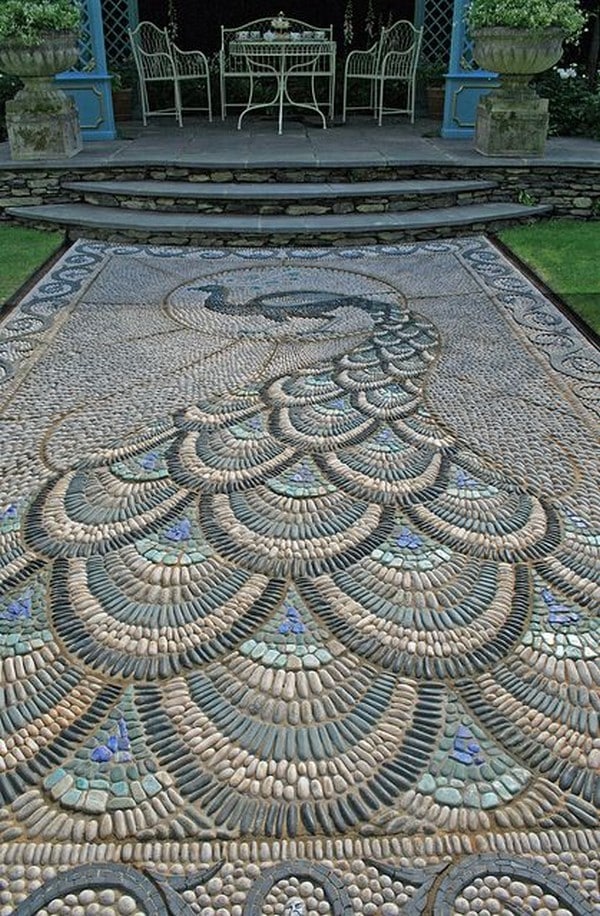 Bring a touch of exotic elegance to your garden with a mosaic design shaped like a peacock. The fan of the bird’s tail is the perfect canvas for showcasing bold colors and intricate patterns using blue and green glass tiles or mirror pieces.