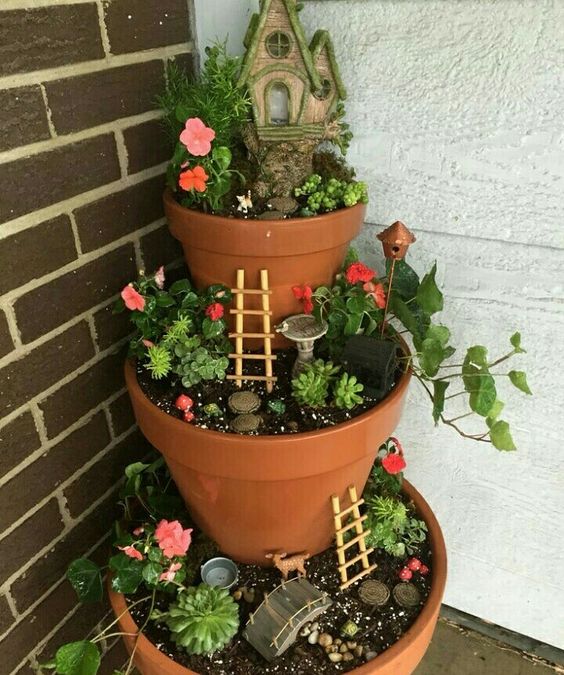 Turn ordinary terracotta pots into a magical fairy garden by stacking them in a pyramid or stair-like shape.