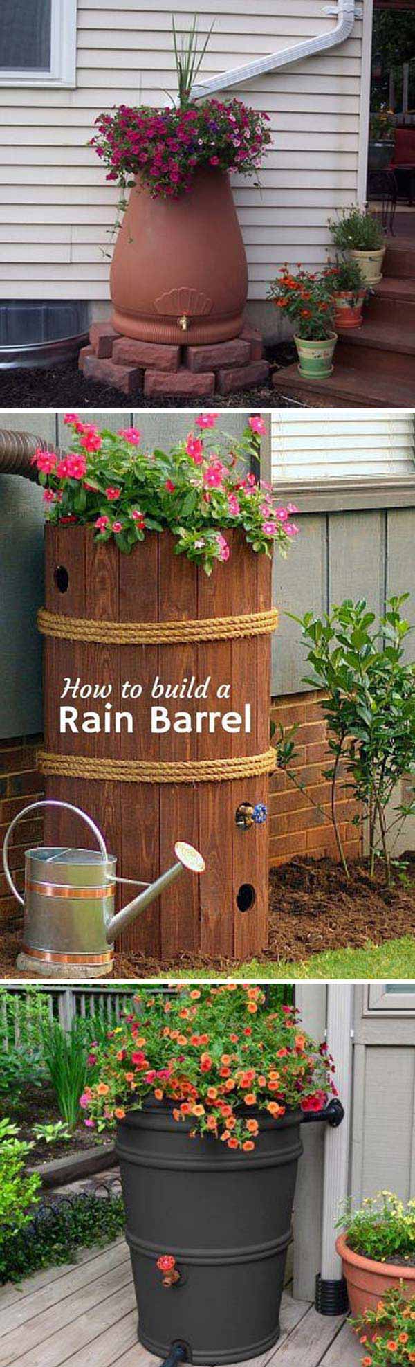 A rain barrel can double as a flower planter for added beauty.