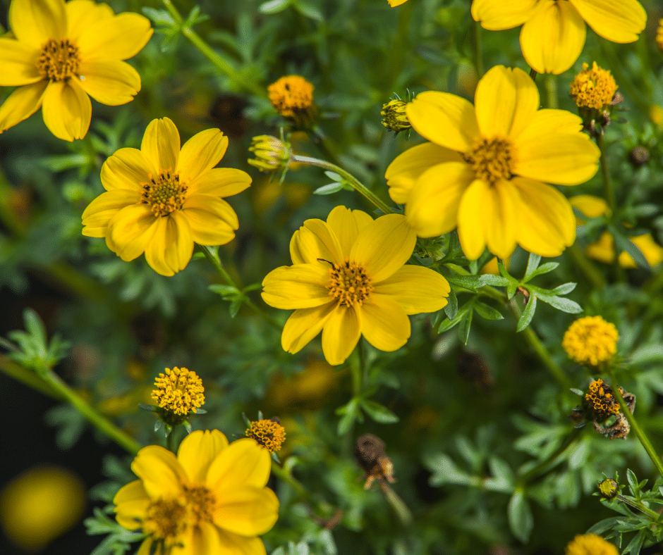 Bidens offers cheerful, small yellow flowers that bloom prolifically in both garden beds and pots.
