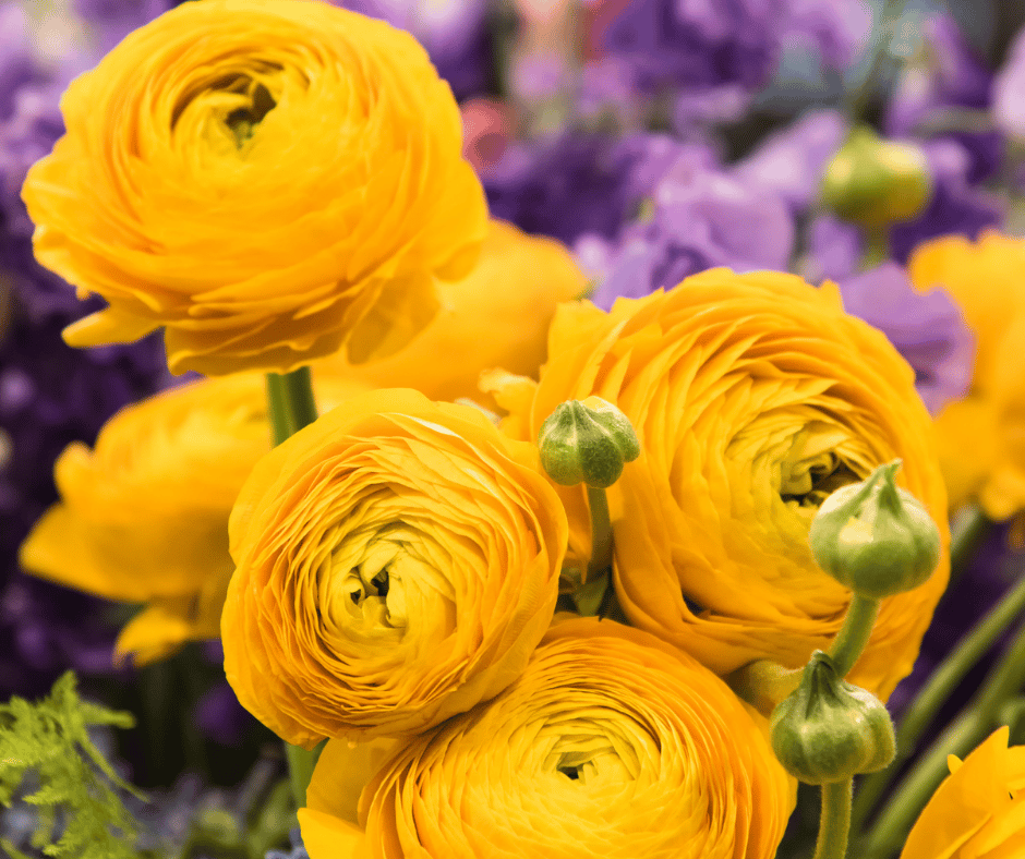 Ranunculus delivers layers of tissue-like petals in brilliant shades. Yellow varieties shine in spring gardens or containers and are loved for their long vase life.