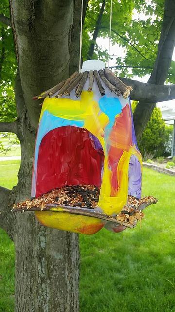Add a perch with a wooden dowel or pencil, fill with birdseed, and hang it from a tree branch.