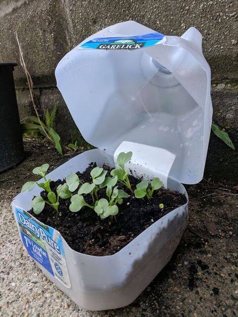 Milk jugs make excellent seed-starting trays. Cut off the top portion, punch holes in the bottom for drainage, fill with seed-starting mix, and sow your seeds.