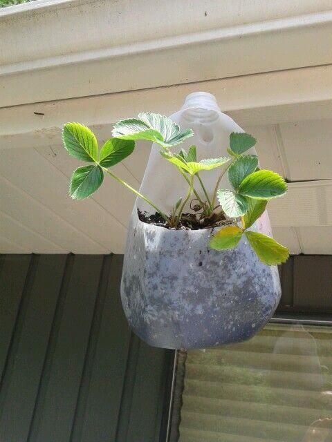 Grow strawberries in small spaces using hanging milk jugs. Cut openings along the sides of the jug, add drainage holes at the bottom, fill with soil, and plant strawberry starts in the side holes.