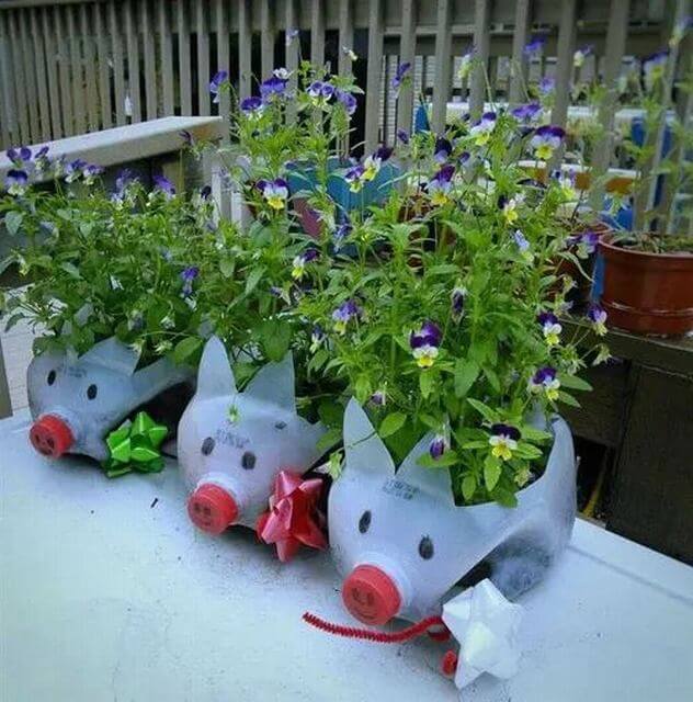 Make gardening whimsical with pig-shaped planters made from milk jugs. Paint them pink, add ears and a snout using cut-out plastic or felt, and grow small flowers or succulents inside.