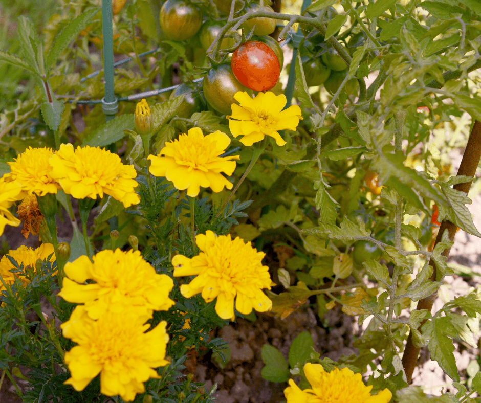 Flowers enhance biodiversity and repel pests that target tomato plants. Consider growing: