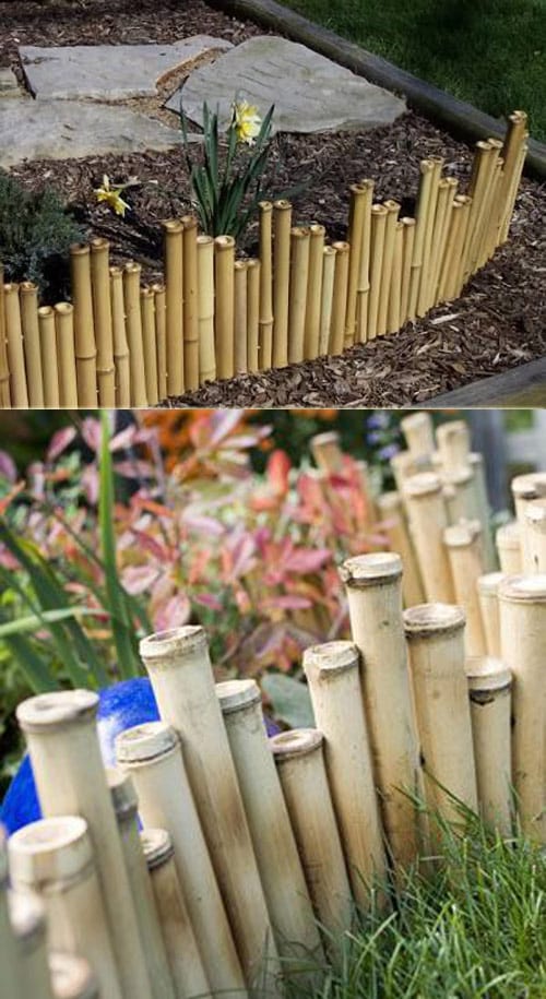 Line up cut bamboo poles of varying heights for a zen-inspired edging design. Bamboo’s natural durability and texture make it perfect for tranquil garden spaces.