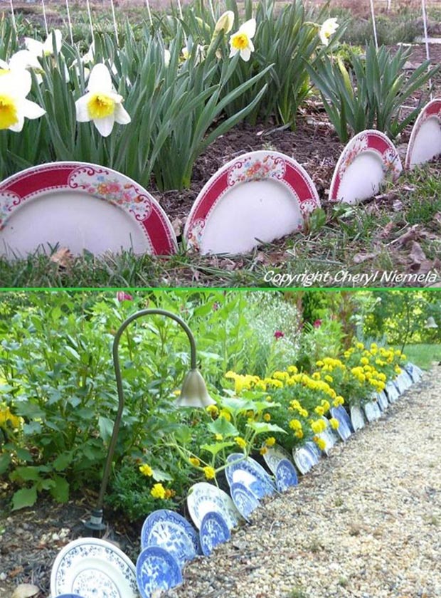 Create a charming, eclectic edge by burying old china dishes, plates, or saucers halfway into the ground. Ideal for cottage gardens or whimsical flower beds.