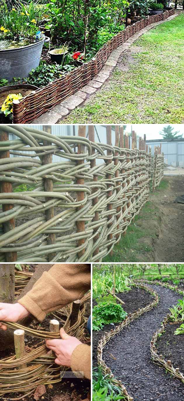 Create a whimsical, natural border by weaving flexible vines, branches, or willow stems into a braided fence. This eco-friendly edging blends seamlessly into organic garden designs.