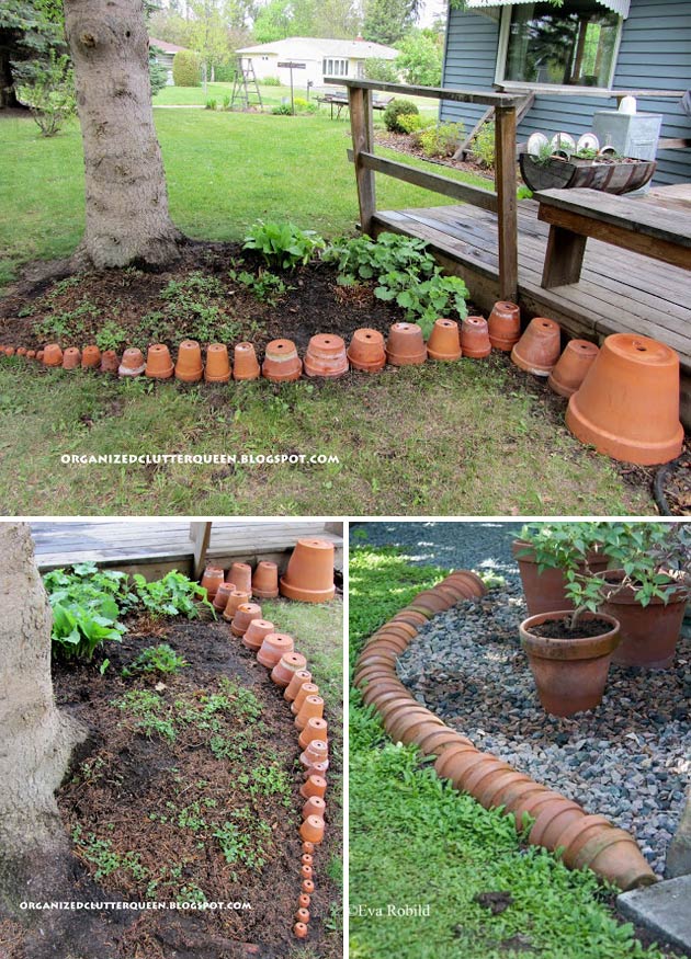 Broken or full-sized terra cotta pots can be half-buried in the soil to create a charming, curved garden edge. This is an especially fun and creative way to reuse cracked pots.