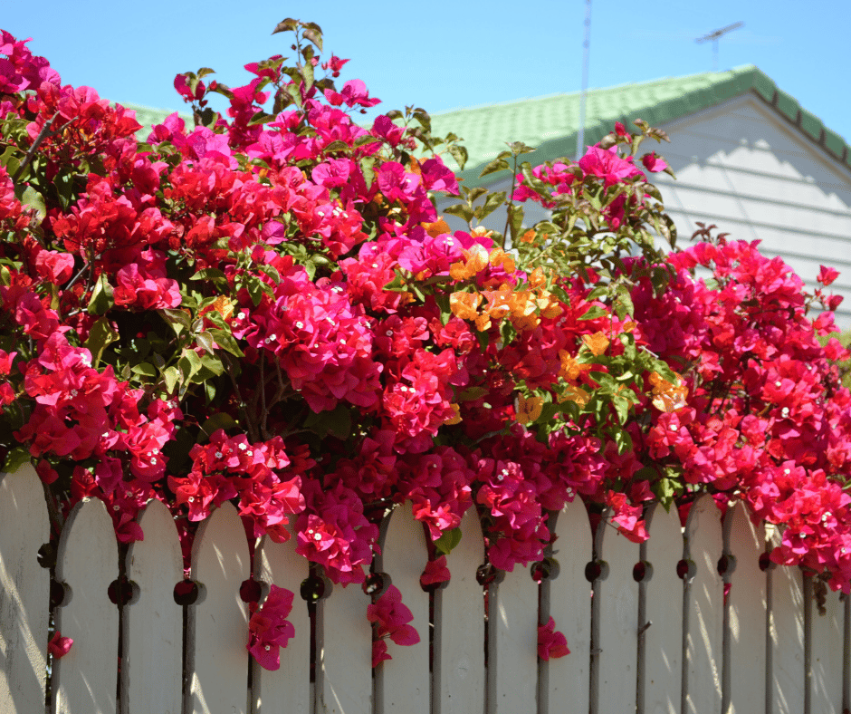 Bougainvillea thrives in heat and tolerates long dry spells. Its colorful bracts (often mistaken for petals) provide brilliant color over trellises, fences, and walls.