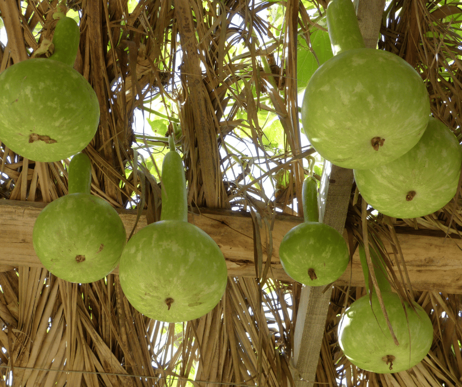 Gourds such as bottle gourds and ornamental varieties store moisture within their vines and fruits.