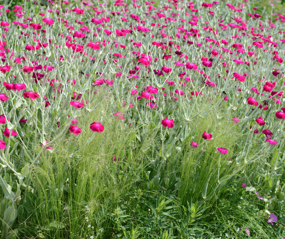 Rose Campion has silvery foliage and vibrant magenta blooms. It tolerates dry soil exceptionally well and adds a soft, romantic feel to dry borders or cottage gardens.
